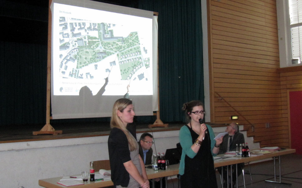 Fast 200 interessierte Bürger waren in die Kraichgauhalle gekommen, um die Präsentation der Entwürfe und Empfehlungen der Studierenden der TU Darmstadt unmittelbar zu verfolgen. Nach verschiedenen Vorberatungen und Begehungen sowie einem Workshop mit Bürgern, Verwaltung und Gemeinderäten hatten die Studenten diese unter der Leitung von Prof. Julian Wekel und Dr. Robert Fischer ausgearbeitet.